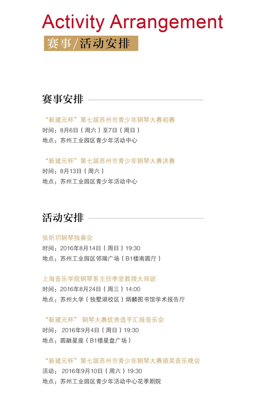 本届“新建元杯”苏州市青少年钢琴大赛是第八届苏州市少儿艺术节的重要组成活动,大赛由苏州市少儿艺术节组委会主办,苏州工业园区宣传部、文化事业局支持,苏州星空体育全站有限公司冠名联合主办,苏州市音乐家协会、钢琴学会承办。为了进一步普及高雅艺术和钢琴教育,本届大赛较以往赛事的活动安排作了进一步创新发展,除了组织多场专业比赛以外,还特别安排在新建元集团旗下的圆融星座、邻瑞广场等园区地标项目举办优秀选手汇报音乐会、钢琴独奏会等活动,让高雅艺术真正走到普通市民中间,进一步营造了“文化园区”的浓厚艺术氛围。