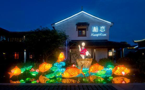 夜幕低垂,雨水洗礼后的老街更加清新静逸,灯光璀璨耀眼,最让人惊喜的莫过于近一百米的紫藤架走廊,几百个苏式花灯、扇形灯、花鸟蝴蝶点缀期间,漫步其中美不胜收;“嫦娥奔月”主景灯倒映于斜塘河,每个角度看过去都是那样壮观;不远处的兔子灯,似乎在与嫦娥相望互动;池塘里的水八仙早已与那斜塘的水,老街的景浑然天成,优雅的静立池中,安静的等待欣赏她的人。