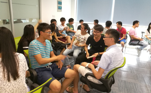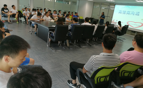 新建元·圆才特约讲师以高情商沟通技巧为题,与大家分享并演练了讨好型,指责型,绝对理智型,打岔型等沟通模式。通过游戏互动和PK体验,练习了先跟后带,录像机说话等高情商沟通技巧。