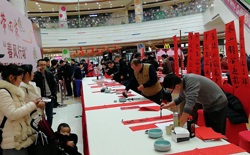 2019年1月12日下午,新建元·景城邻里中心举办了主题为“新春纳福、幸福到家”的迎新年送春联首场系列活动。这次活动由苏州工业园区宣传部牵头与邻里中心公司共同举办,邀请了丁建中、林再成、顾志军等20位颇有建树的苏州艺术家,撰写了上百幅金字春联,寓意来年财运滚滚、人财两旺。现场还贴心地为大家准备了展架,在送春联的同时也分享关于春联的相关知识。