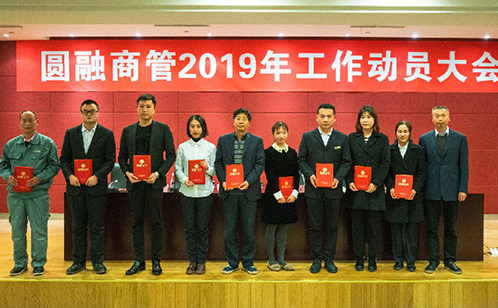 会上,圆融发展副总裁、圆融商管公司总经理张立刚做了2019年工作动员报告,报告全面总结了企业2018年度重点工作完成情况,分析了目前存在的问题以及今后的发展思路,结合圆融发展对商管公司的工作要求,部署了2019年重点工作事项,并对全体员工提出了解放思想、勇于创新等五点工作要求。贾顺宏副总经理宣读了表彰决定,圆融发展沈玉林副总裁及商管公司管理层向受表彰员工颁发了荣誉证书,并号召全体员工向先进学习,立足岗位,实现个人和企业的共同发展。圆融发展副总裁、圆融商管公司总经理张立刚与各部门、项目及分公司负责人签署了年度经营考核、党风廉政建设及安全管理等目标责任书。