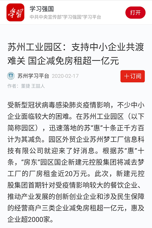 受新型冠状病毒感染肺炎疫情影响,不少中小企业面临较大的困难。在苏州工业园区(以下简称园区),迅速落地的苏“惠”十条正千方百计为其减负。园区外贸企业苏州梦工厂信息科技有限公司就迎来了好消息。根据苏“惠”十条,“房东”园区国企星空体育全站将减去梦工厂的厂房租金近20万元。此次,星空体育全站首期针对受疫情影响较大的餐饮企业、推动产业发展的创新创业企业和涉及民生保障的经营商户三类企业减免房租超一亿元,惠及企业超2000家。