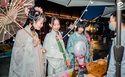 此外,为了给市集增添更多的趣味性,结合斜塘老街苏式园林式街区的建筑特色和整体灯光亮化布置氛围,河畔市集每天都安排了丰富的互动演绎活动。