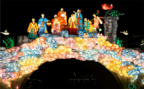 已经76岁高龄的苏州灯彩项目国家级非物质文化遗产代表性传承人—汪筱文老师带着他平均年龄超50岁的制作团队,经过3个多月的设计制作,在斜塘河畔再次呈上了一个个苏州灯彩的精心之作。长24米的主景灯“八仙过海”灯组取材于耳熟能详深受喜爱的八仙故事,八位神仙大咖造型各异,脚踩祥云乘风破浪,动感十足栩栩如生。水中的倒影更是色彩斑斓,相映成趣,远远望去十分震撼。