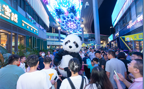 此外,天幕东街举办厂牌电音派对,特邀知名厂牌音乐人,表演当下非常受年轻人喜爱的嘻哈Hip-Hop、复古Disco、科技舞曲Techno三种音乐风格;西街举办“古典也是时尚”音乐会,演绎《天空之城》《千与千寻》《蓝色多瑙河》《夜来香》等知名曲目,从潮流到古典,在天幕下实现无缝切换,彰显潮流的不同切面。同时穿插了秋夜玩唱会,每晚进行歌手演出,营造秋夜晚风的氛围。另外,现场设置的大型气模装置,吸引了大批顾客前往拍照打卡。活动期间,每天进行的熊猫巡游,也深受小朋友及家长的喜爱。