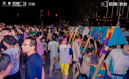 晚会开始前,在圆融广场上举行了集市文化活动。零食、手作、非遗特产、旧书置换、环保概念宣传等一个个集市摊位充满创意与个性,吸引了小区居民的目光,让他们流连驻足。
