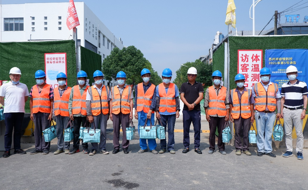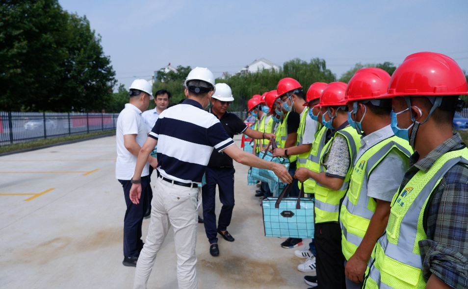 在科技载体项目现场,苏相开发公司为工人送去了各类防暑降温物品,对他们在高温下坚守岗位,克服困难,为项目建设作出贡献表示感谢,并叮嘱他们在作业时务必要落实相关保障措施,注意安全,以良好的精神状态投入到工程建设中。