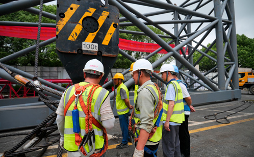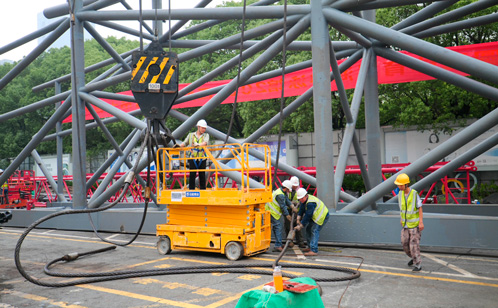 本次吊装的巨型桁架全长60米,总重量近200吨。为确保安装万无一失,项目组多次组织专家论证方案、规划路径,最终确定地面完成巨型桁架的拼装后,再分两段进行吊装的方案,保障了施工的安全性和准确性。