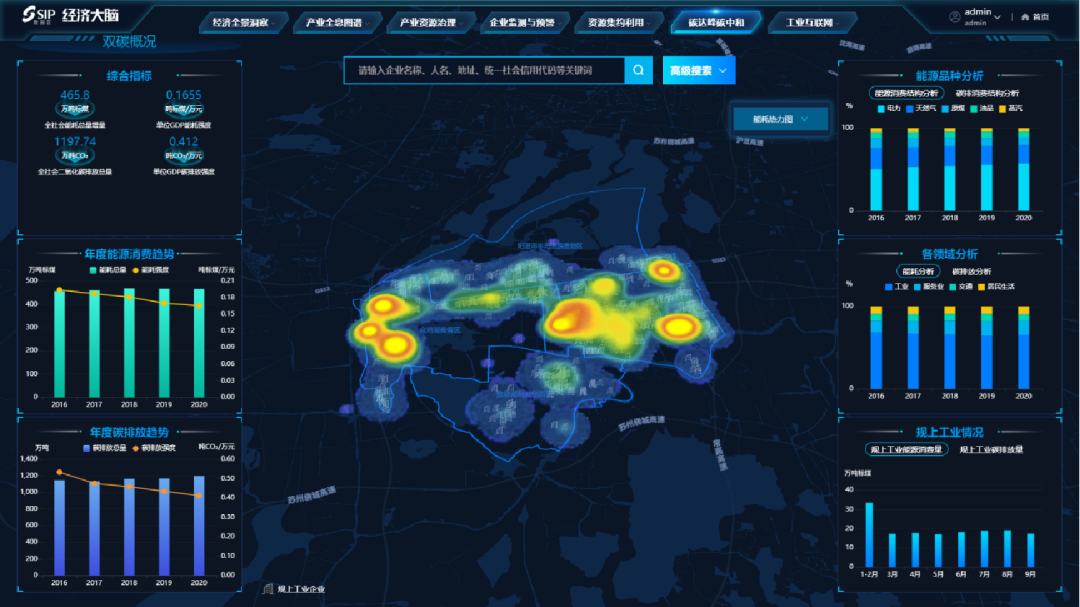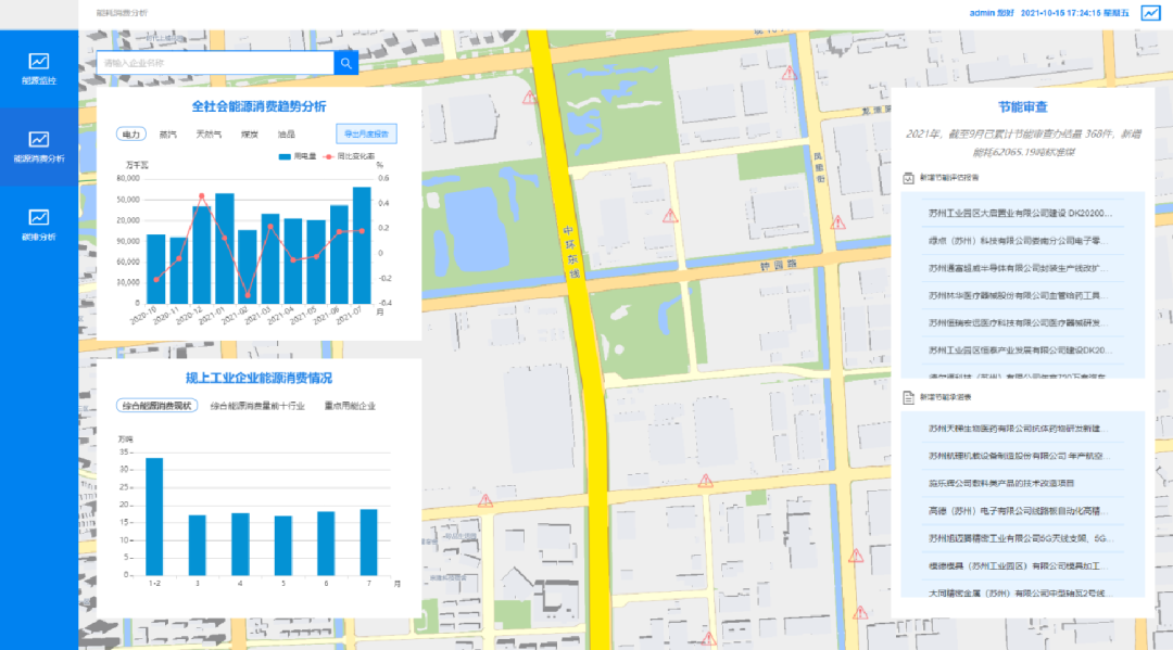 目前,系统已建设完成并投入运营,累计接入企业5757家,光伏项目101个,充电站123个。系统通过实时和历史能源数据监测,对水、电、气、新能源用能进行预警管理;通过能源消费分析,对重点规上企业用能进行趋势预测;通过碳排分析和节能审查,对用能企业进行过程跟踪,旨在为早日实现碳达峰碳中和提供可追溯的数据参考和决策支撑。
