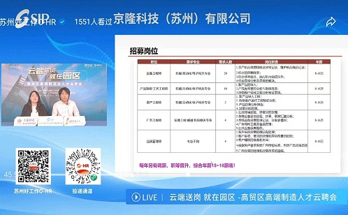 本次直播活动为高端制造业专场,邀请到了苏州华星光电技术有限公司、京隆科技(苏州)有限公司、苏州群策科技有限公司和矽品科技(苏州)有限公司4家优秀用人单位参与。四家企业的人力资源负责人化身带岗主播,在线为求职者们介绍招聘岗位、福利薪酬等信息。求职者们扫描屏幕的项目二维码,查看具体的招聘岗位、福利等,并参与简历的投递。据统计,本场招聘会共计提供22个岗位64个招聘需求,吸引了近600位求职者入场,浏览量共计3.4万,当天累计收到求职简历135份。