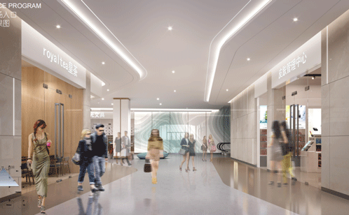 项目以湖泊为灵感来源,以水为纽带,贯穿整个室外和室内场景,通过流动的形态、自然活跃的变化、错动的立面传达生命的动感,打造一个服务社区、居民生活便利的邻里中心。