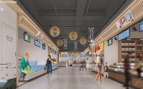 菜场区的装修现代简约,注重生活趣味美学场景的打造,既继承了传统菜场的“烟火气、人情味”,又有当下市集“便捷高效、标准化”的创新,摊位设计上还融入了二十四节气时令食景图的文化意象,统一吊楣形式设计,为市民带来全新的体验感。