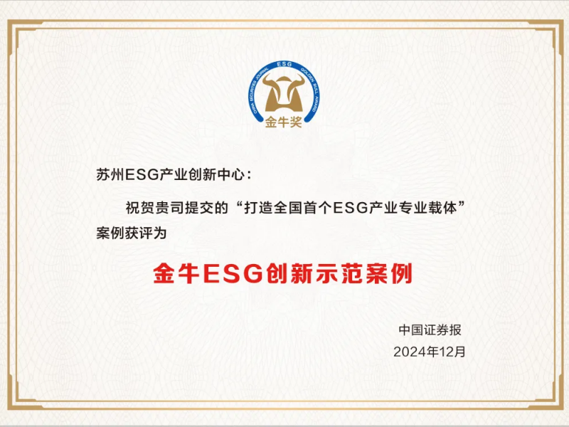 近日,在2024金牛企业可持续发展论坛暨第二届国新杯·ESG金牛奖颁奖典礼上,苏州ESG产业创新中心项目获评国新杯·金牛ESG创新示范案例。苏州ESG产业创新中心由新建元城市发展建设运营,旨在打造全国首个ESG产业专业载体。